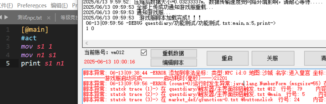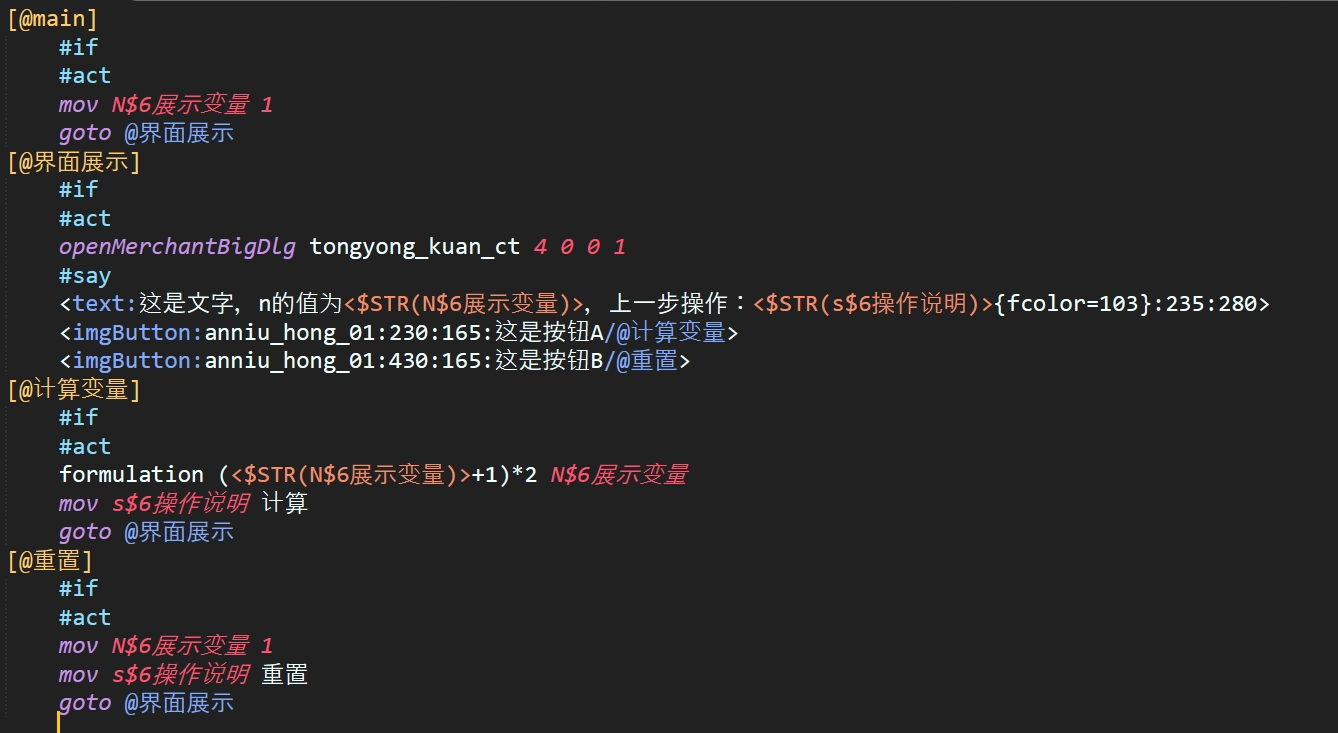 ※非常重要:所有的脚本文件中,相同命名的变量是互通的。这意味着你命名的变量S$变量1可能也被别人用作不同的值。为了防止变量打架导致的匪夷所思bug,请规范命名。例如:n$6活动名道具数量,$后的数字为各自GM的代号