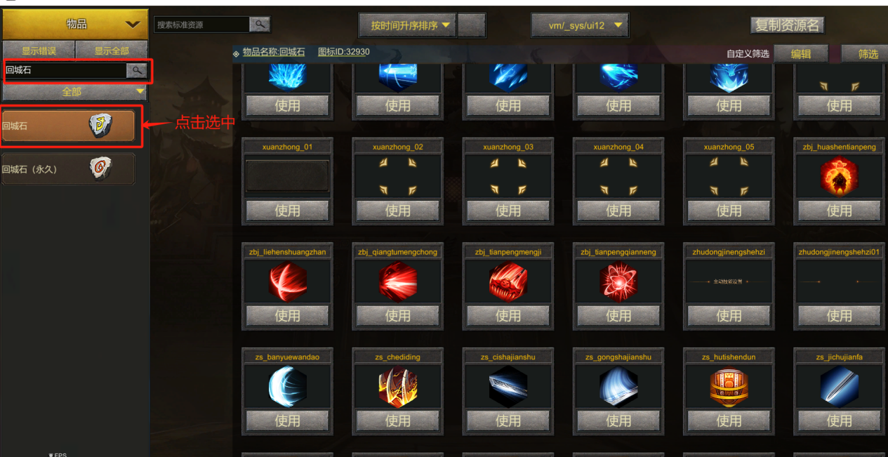 大部分情况下,内置图标可以在静态图标或ui12中找到满足要求的。在左侧搜索栏输入新建的道具名,选中后在认为合适的资源下面点击“使用”,该资源的就完成了贴图配置。(特戒编辑器的本质是可视化的修改表格数据)注意:已被其他道具使用的贴图名称上会有“已使用”的标注,尽量不要再次使用。