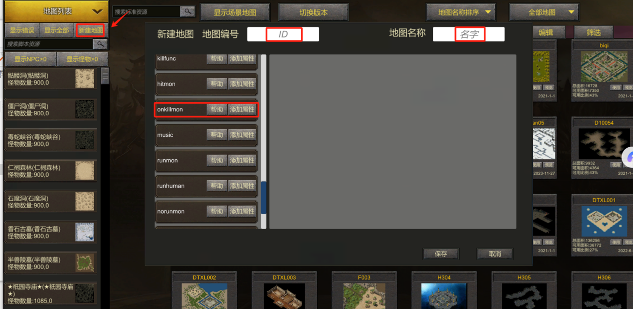 地图编号和名称都写地图的正式命名即可,如果涉及到杀怪,请添加属性onkillmon,点击保存。如果创建成功,在左侧搜索栏可以搜索到刚创建的地图。