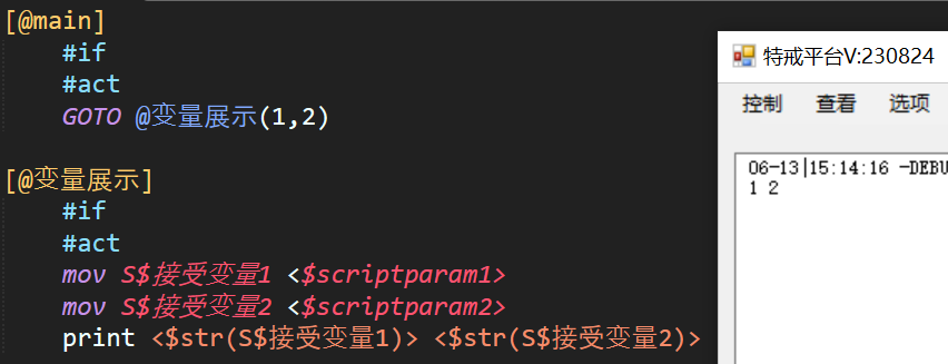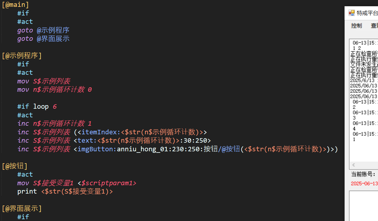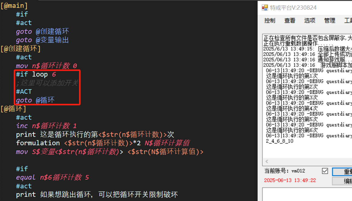 #if loop 的循环内容实际仅在红框内,即该#if下的#act,循环结束后继续执行下面的命令。值得注意的是:n$循环计数 以及 S$变量$str(n$循环计数) 的使用。这样的动态计数与赋值能满足大部分循环的实际使用场景。执行次数支持变量