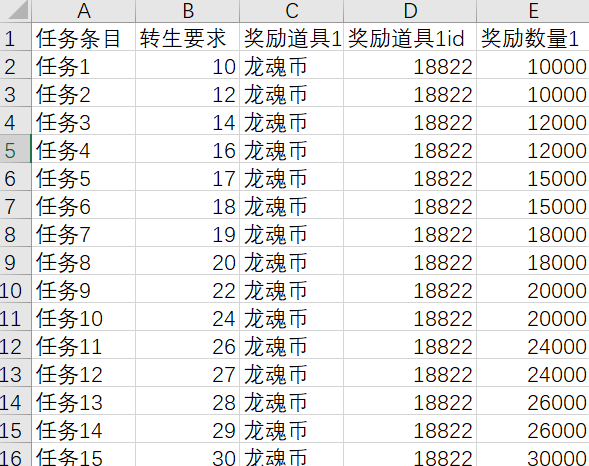 此外,表头的其他命名(奖励道具1、奖励数量1等)不可重复(不同表可复用)。