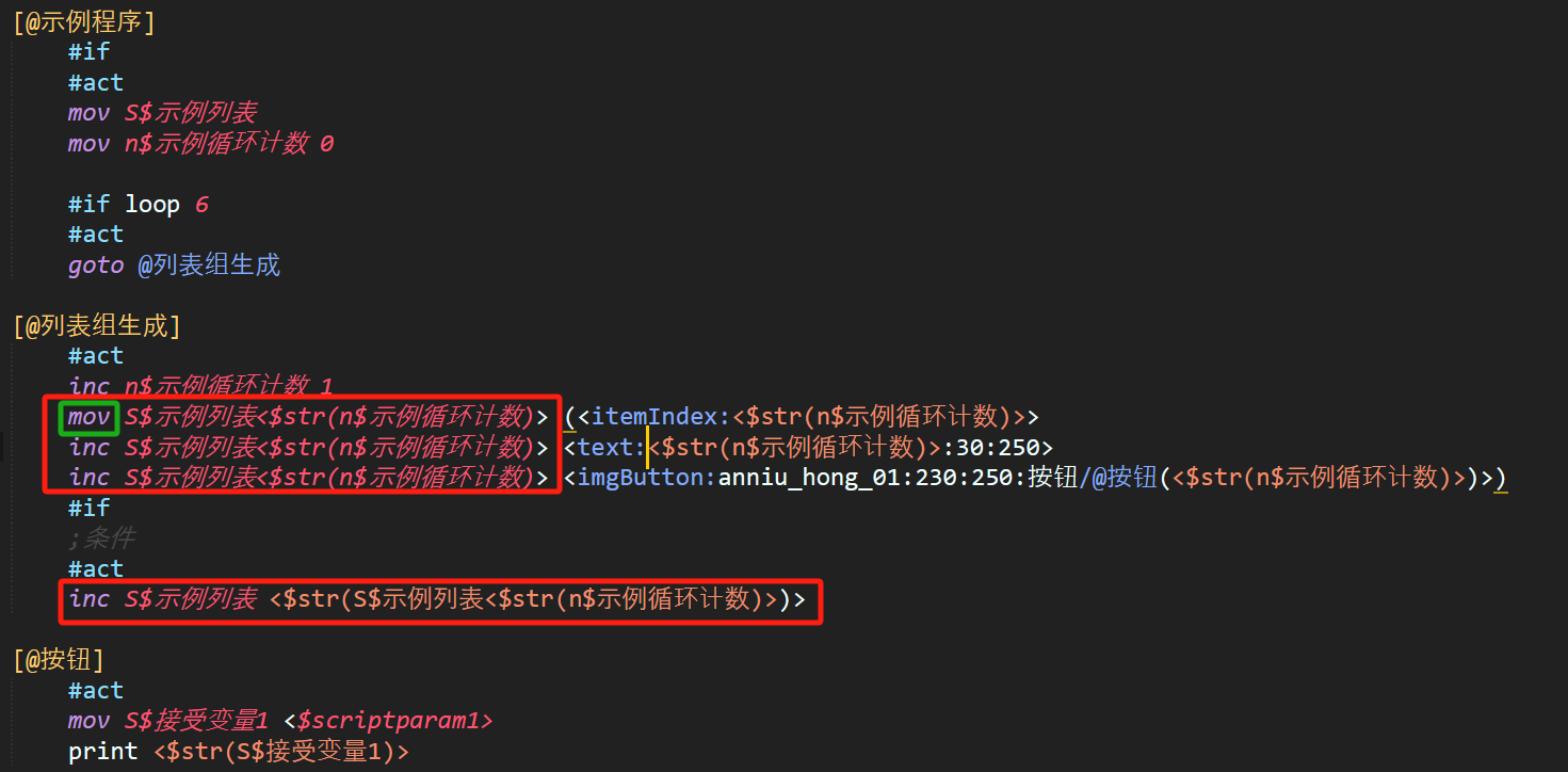 修改imgButton命令 imgButton:anniu_hong_01:230:250:按钮/@按钮$str(n$示例循环计数)。这里是利用了程序格式,将跳转块从[@按钮]变成了[@按钮1]、[@按钮2]……可以对每个独立的按钮进行设置
