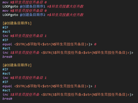 值得注意的是,loop语句本身挂在#if中,这也意味着如果#if内条件持续不满足,循环指令会持续不执行。这一点与下面的loopgoto有显著区别。于是该语句可以实现动态检索,例如循环执行200次,但在第X次退出。这样的写法在scripts\Mir200\Envir\QuestDiary\便捷功能 的两个功能中都有体现,可以查看了解